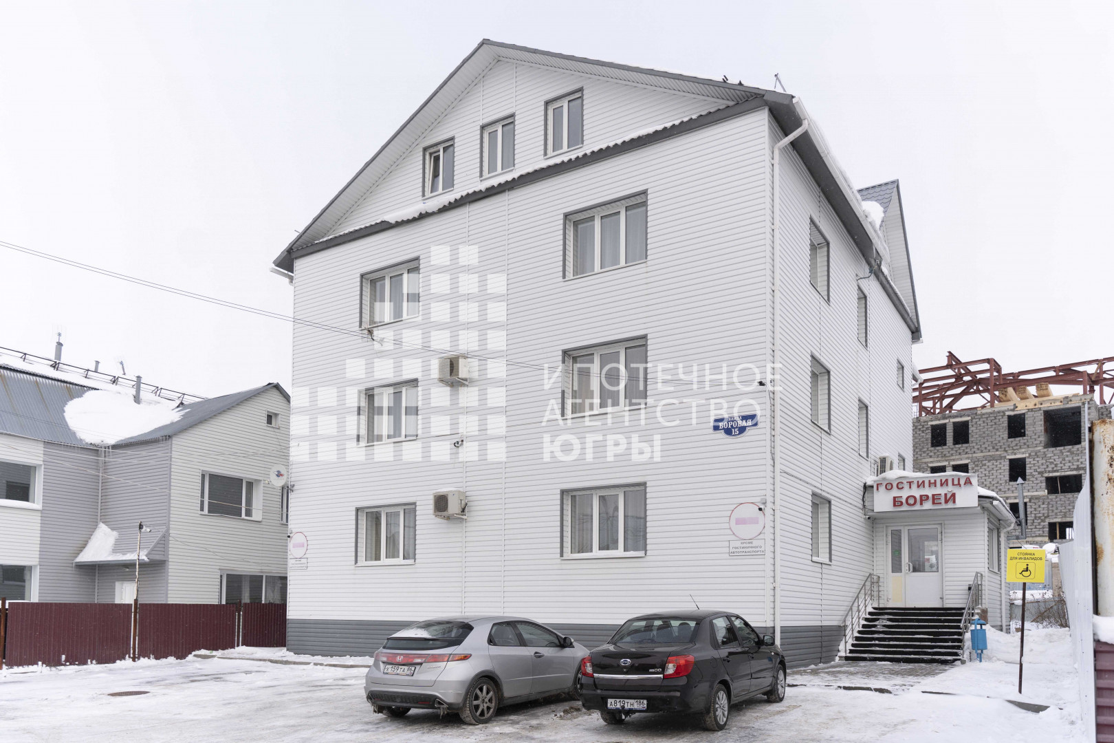 Город Ханты-Мансийск, ул. Боровая 15; действующая гостиница, отдельно стоящее здание (коммерческого назначения), площадь 850 кв.м. + 6 соток земли (в собственности у одного физ лица, без обременений), 4 этажа и подвальный этаж